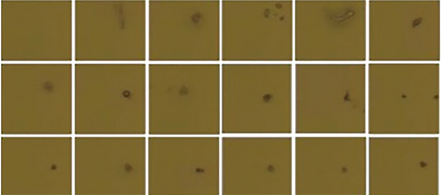 即使經過過濾,生產前樣品中仍存在殘留微污染粒子。粒子可視化分析顯示,其主要來源為 NMP 混合不均所造成的凝膠型異常。透過 AI 粒子辨識與分類技術,系統可針對結晶凝膠粒子進行快速區分,協助製程人員即時辨識異常、定位污染來源,並有效提升前段製程控管效率。