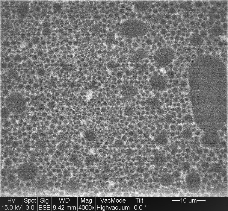 下圖為人類母乳在SEM底下的畫面,可以看到母乳的脂肪分子尺寸較美乃滋大許多,這也是母奶較容易產生油水分離現象的原因。