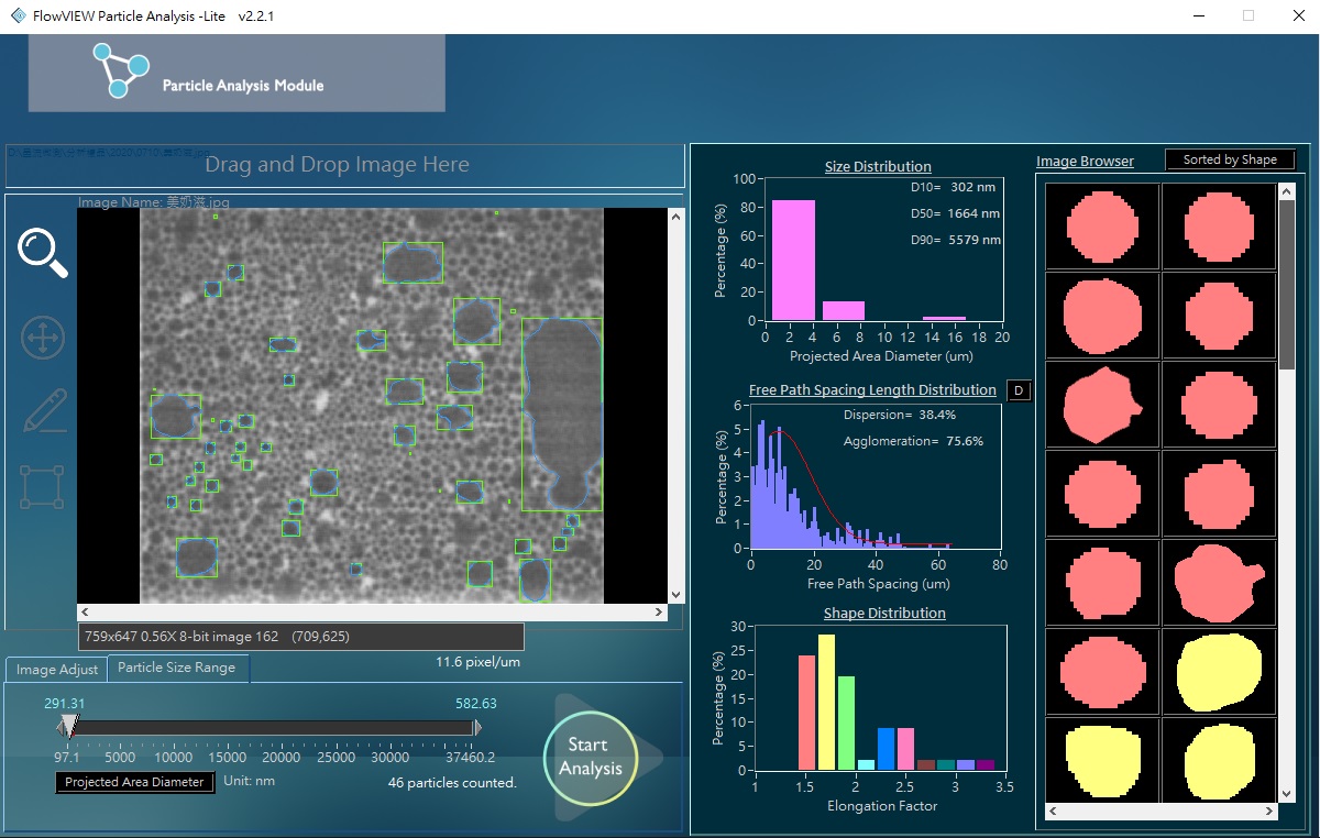 不論是材料分析還是材料檢測,邑流的液態材料檢測技術不只是臨場觀測乳製品中的脂肪分子,還可透過高皆影像分析針對脂肪分子進行自動化分析,取得液態材料的粒子外型、尺寸分布與分散/團聚性等數值。我們可由下方左圖分析結果可看出,全脂鮮乳中的脂肪分子,粒徑分布的尺寸約於200-1450nm的區間,其中又以直徑0.5微米以下的分子佔多數。而右圖的材料分析結果則可看出,美奶滋的脂肪分子,尺寸大多分佈於291-582nm的區間,整體分子尺寸明顯小於全脂鮮乳。透過此累精準分析報告,大幅提升研發效率與結果精準度,非常適用新興材料研發。甚至還能透過加溫、加控等方式,進行電化學相關實驗,亦非常適用於高皆車用晶片、電池材料研發。