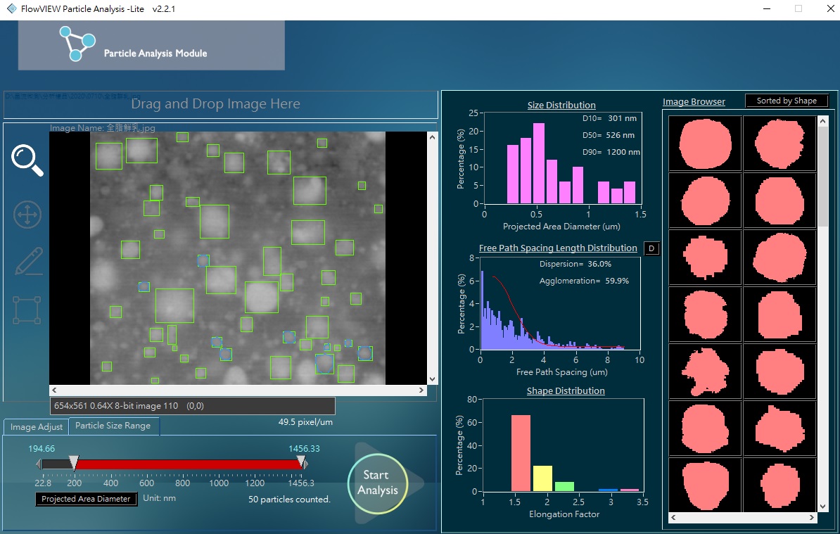 低脂鮮乳的脂溶性維生素,如維生素A及維生素E等,確實低於全脂鮮乳。不過,根據國民營養調查的結果顯示,台灣人每日攝取的維生素A大多超過建議攝取量,所以不需要特別補充維生素A。且鮮乳也非攝取維生素E的主要途徑。若想有效補充維生素E,還是要多吃植物油、深綠色蔬菜、黃豆製品、全穀類、堅果類的食物。而我們主要從鮮奶中獲得的三大類營養成分,蛋白質、鈣質與維生素B2等,低脂和全脂鮮乳中的含量是相近的。換言之,如以主要營養素角度切入,低脂鮮乳的營養並沒有比較少,對於不想攝取太多熱量的人來說,仍是擁有高營養價值的最佳飲品選擇!不論是材料分系還是材料檢測,邑流的液態材料檢測技術不只是臨場觀測乳製品中的脂肪分子,還可透過高皆影像分析針對脂肪分子進行AI自動化分析,得到分子外型、尺寸分布與分散/團聚性等數值。由上左圖分析結果可看出,全脂鮮乳中的脂肪分子,尺寸大多分佈於200-1450nm的區間,其中又以直徑0.5微米以下的分子佔多數。由上右圖分析結果可看出,美奶滋中的脂肪分子,尺寸大多分佈於291-582nm的區間,整體分子尺寸明顯小於全脂鮮乳。